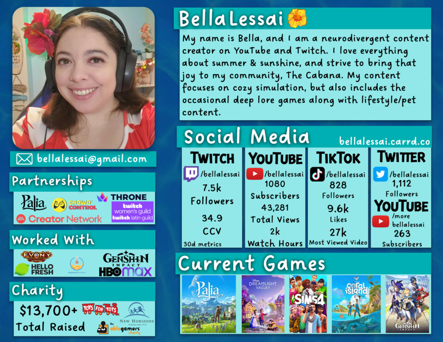 The Cabana was founded on August 24, 2020 on Twitch by myself and my brother, Wyatt. I reached Twitch affiliate just under a month later, on September 15, 2020. Over the past 3 years, my focus has been to create a community that lives in Eternal Summer where you can be yourself and anything is possible.I have a 6 year old dog named Apollo who sometimes makes appearances in my content. From time to time he can be heard in the background of streams barking at the world. He is fondly known as our mascot and loves to show off! You may even see him sleeping on stream.I was recently diagnosed with ADHD and an eating disorder, which has led to my becoming an advocate for mental health awareness.My dream of being a content creator dates back to 2006 when the first YouTubers were becoming popular. When the pandemic lockdown started, I lost my job and suddenly I had no more excuses on why I shouldn't take a chance and go for my dream.I've raised over $13,000 for charity, and have met so many wonderful people. This journey has been amazing and I can't wait to see what comes next!